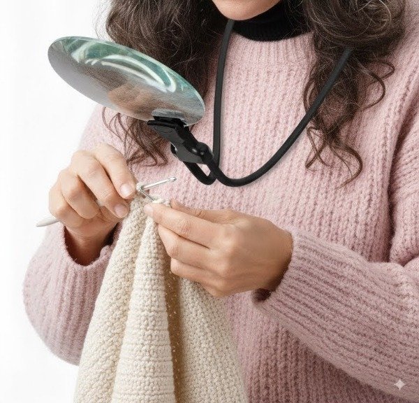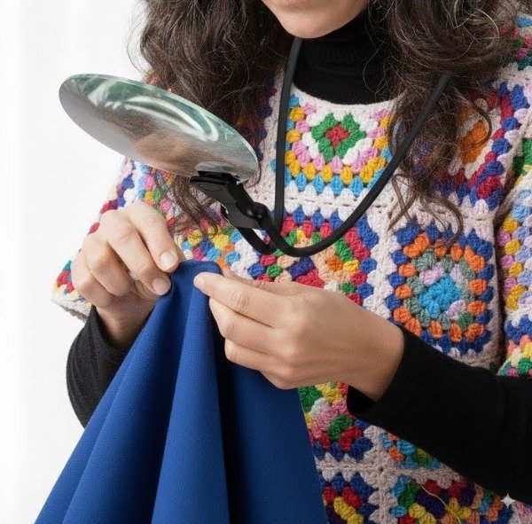Lupa de aumento manos libres 3 en 1 con aumento 5x. Tamaño de lente: 13 cm. Se puede usar colgada al cuello, apoyada en el escritorio o sostenida en la mano. Ideal para tejer, bordar, coser o leer con mayor claridad, especialmente útil para personas con baja visión. Lente de vidrio de alta calidad.